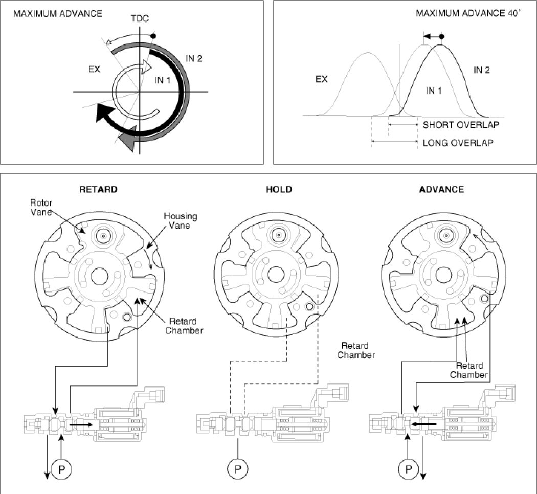 The CVVT changes the phase of the intake camshaft via oil pressure.