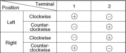3. Connect the motor terminals directly to battery voltage (12V) and check that the motor operates smoothly. Next, reverse the polarity and check that the motor operates smoothly in the reverse direction. If the operation is abnormal, replace the motor.