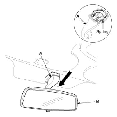 1. Push the inside rear view mirror base (A) down to wards the inside rear view mirror assembly (B).