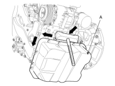 - Insert the SST between the oil pan and the ladder frame by tapping it with a plastic hammer in the direction of 1 arrow.