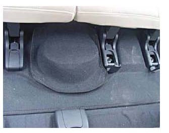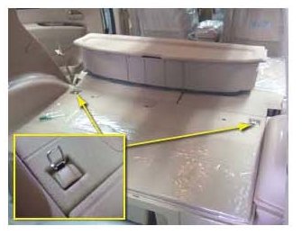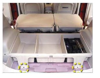 2. Remove the four (4) trim tabs and fasteners. Lift the rear storage bin out of the vehicle.