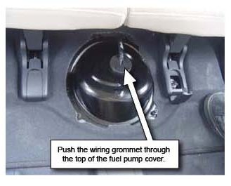 3. Remove the four (4) fuel pump cover retaining bolts. Push the wiring grommet through the top of the fuel pump cover. Relocate any rear interior floor mat(s).