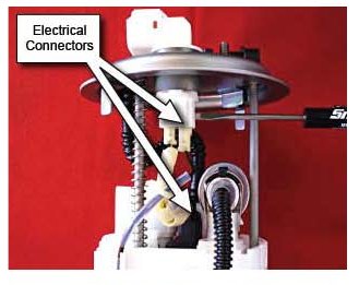 6. Disconnect the upper sending unit wiring connector by gently depressing the harness connector tab. Disconnect the lower fuel pump motor connector. Cut the tie-wrap from the sending unit wiring.