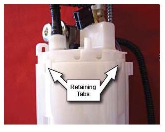 7. Release the three (3) pump reservoir retaining tabs. Separate the fuel pump assembly from the reservoir.