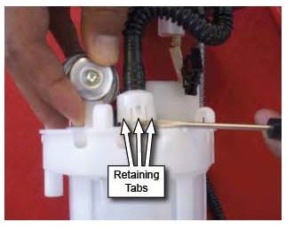 9. Release the three (3) retaining tabs from the discharge hose using a flat head screwdriver or pick. Discard the old fuel pump assembly.