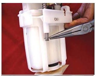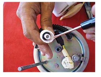 8. Compress the top of the fuel pump and remove the c-clip from the upper pump support. Separate the fuel pump upper assembly from the fuel pump assembly.