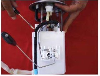 4. Place two ~ three shop towels or plastic covering(s) around the base of the body opening. Remove the fuel pump from the tank and immediately place the fuel pump into a small catch pan. Move the fuel pump to a clean area for the disassembly procedure.
