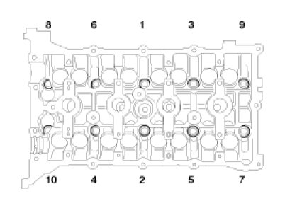 Using triple square hexagon wrench, install and tighten the 10 cylinder head bolts and plate washers, in several passes, in the sequence shown.