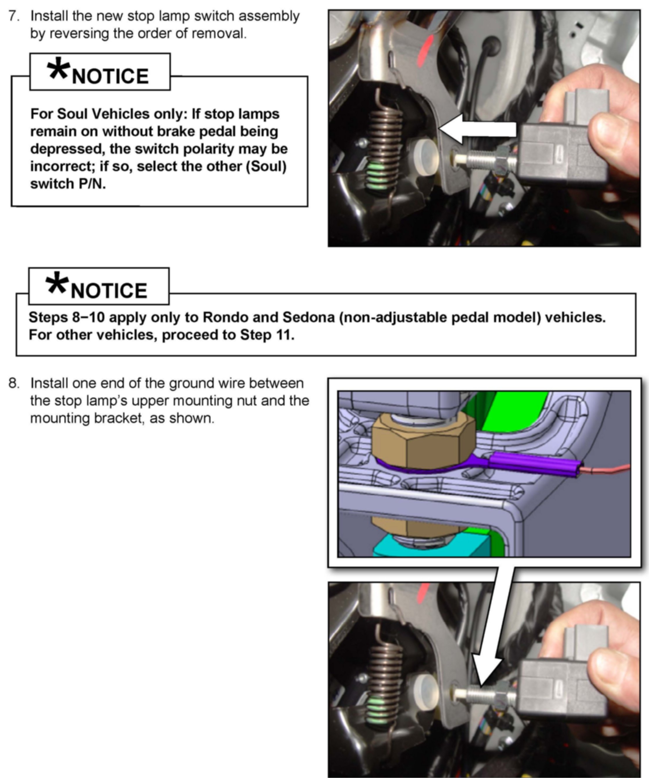 This bulletin provides information relating to the replacement of the stop lamp switch on some 2007-2010MY Sportage (KM), 2007-2010MY Rondo (UN), 2007MY Sedona (VQ), 2010-2011MY Soul (AM), 2007-2011MY Sorento (BL/XM), and 2011MY Optima (TF) vehicles within the production date ranges shown in the table below. Carbonization of the point of contact for the stop lamp switch can intermittently interfere with electric current through the switch circuit. As a result, one of the switch functions can affect the vehicles brake lights and they may not come on when the brake pedal is depressed or may remain illuminated when the pedal is released.