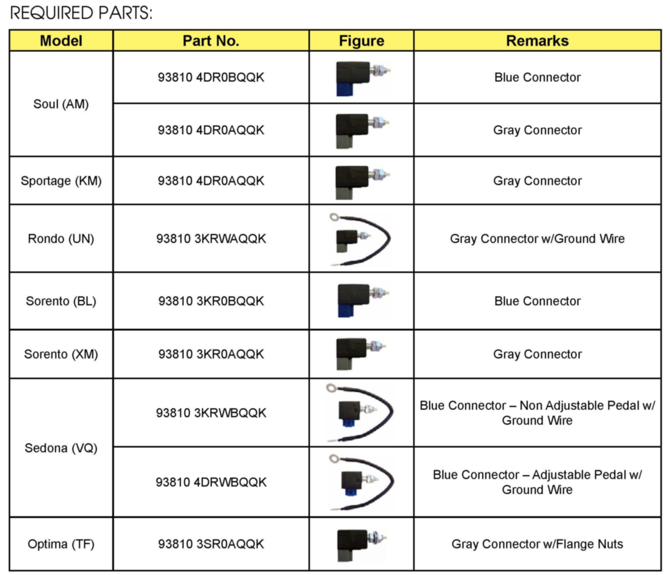 Three (3) replacement procedures using eight (8) different part numbers are covered in this Bulletin. Each procedure covers specific vehicle models and stop lamp switch parts.