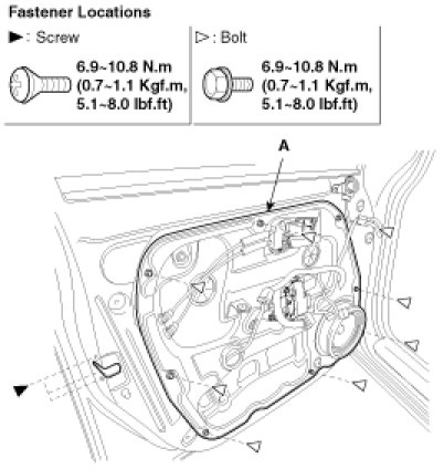 3. Loosen the door module mounting bolts, then remove the door module (A).