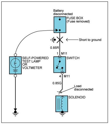 E. When the self-powered test lamp glows, or ohmmeter registers. there is a short to a ground in the wiring near that point.