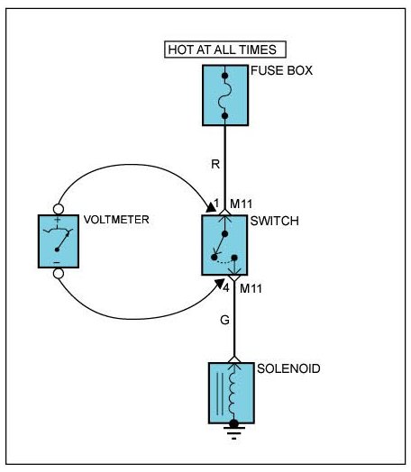 A. Connect one lead of a test lamp or voltameter to a ground. If you are using a voltmeter, be sure it is the voltmeter's negative test lead you have connected to ground.