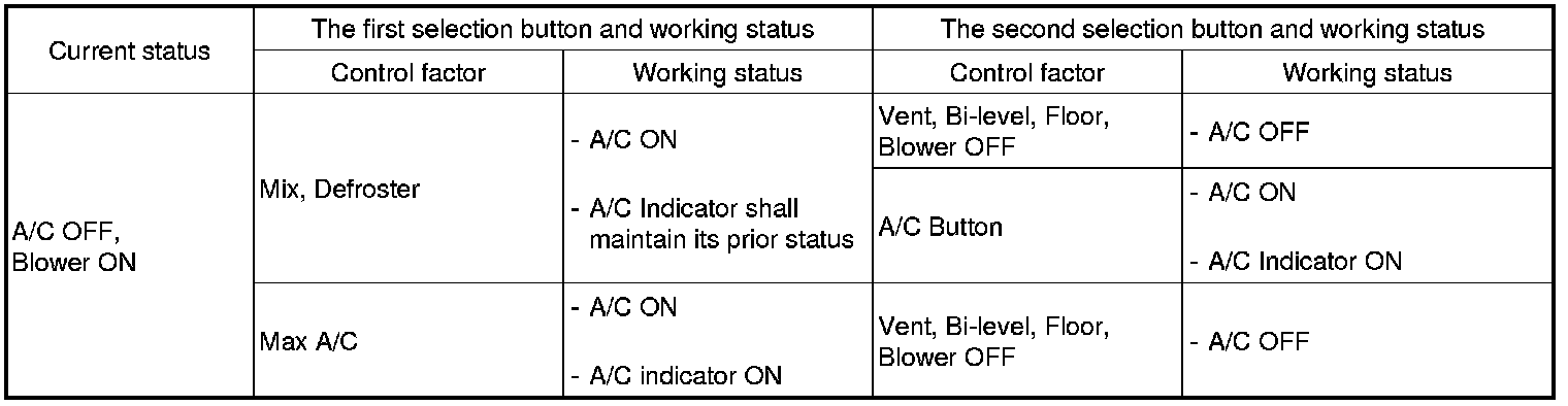 (1) When defroster or mix selected, A/C ON, A/C select and A/C output signal are ON, the A/C indicator shall maintain its prior status, working in the fresh mode to help defrost.