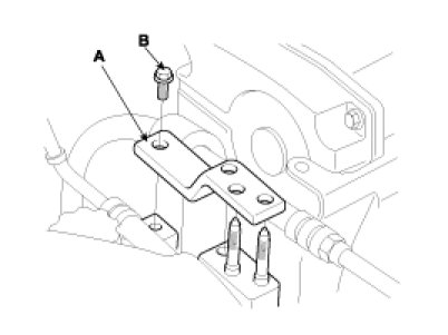 5. Install the idler pulley (A) and tighten the bolt (B) to the specified torque.