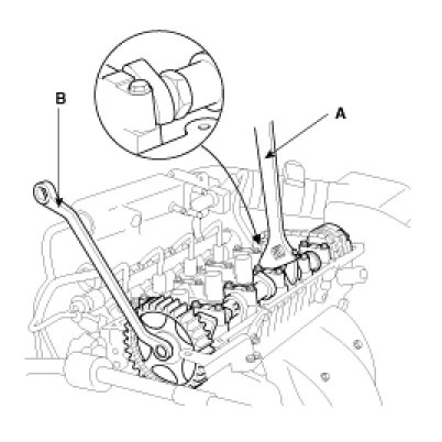 (1) Hold the hexagonal head wrench (A) portion of the camshaft with a wrench (B), and remove the bolt and camshaft sprocket (C).