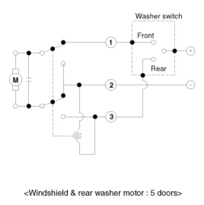 2. Connect positive (+) and negative (-) battery cables to terminals 1 and 2 respectively to see that the washer motor runs and water sprays from the front nozzles.