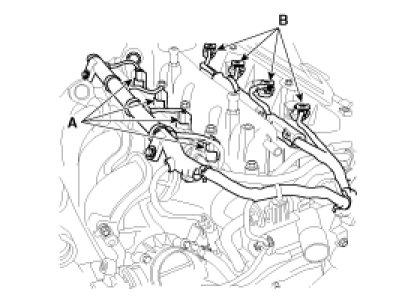 (16) Disconnect the injector connectors (A) and the ignition coil connectors (B).