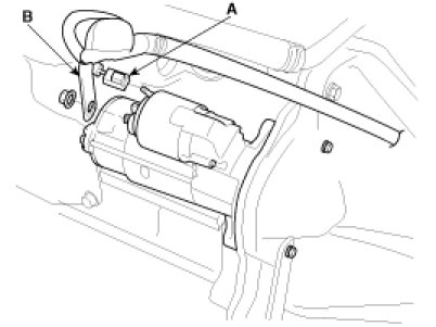 (17) Disconnect the starter connector (A), and cable (B) from the starter.