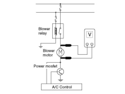 2. Manually operate the control switch and measure the voltage of blower motor between pin 1 and 2.