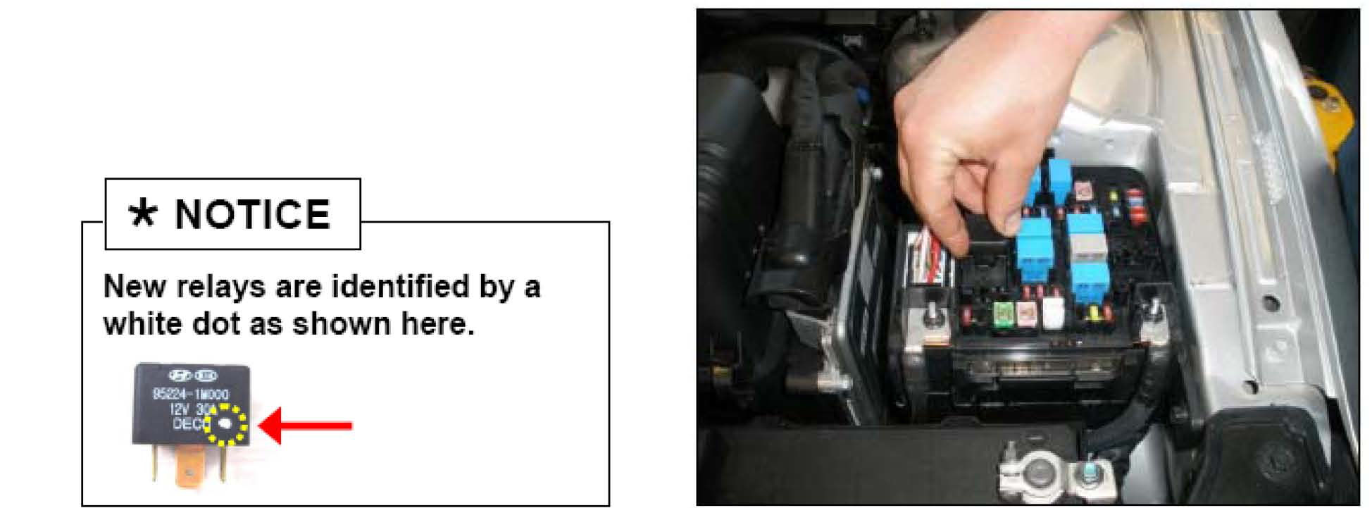 Some Forte/Forte Koup vehicles manufactured from July 16th to August 20th, 2009 may experience concerns of inoperative A/C blower, high/low cooling fans or engine starter motor. The concern may be caused by poor contacts inside the four (4) relays located in the engine compartment junction box as shown. It is recommended that any vehicle within this production range be repaired prior to retail sale to a customer. Additionally, any vehicle coming in for service should be checked and if necessary repaired before it's returned to the customer.