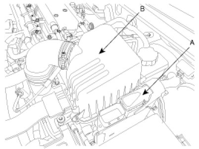 24. After installing the air cleaner assembly (B), connect ECU connector (A).