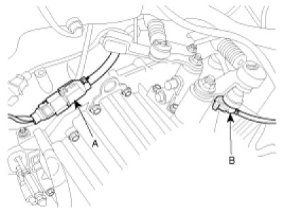 6. Disconnect the vehicle speed sensor connector (A), the back up lamp switch connector (B).