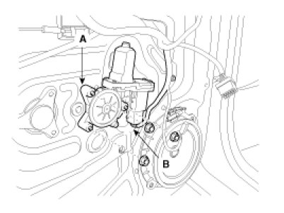 2. After disconnecting the connector (B), unbolt motor, remove the power window motor (A).