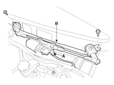 3. Remove the windshield wiper motor and linkage assembly(B) after removing 2 bolts. Disconnect the wiper motor connector(A) from the wiper motor & linkage assembly.