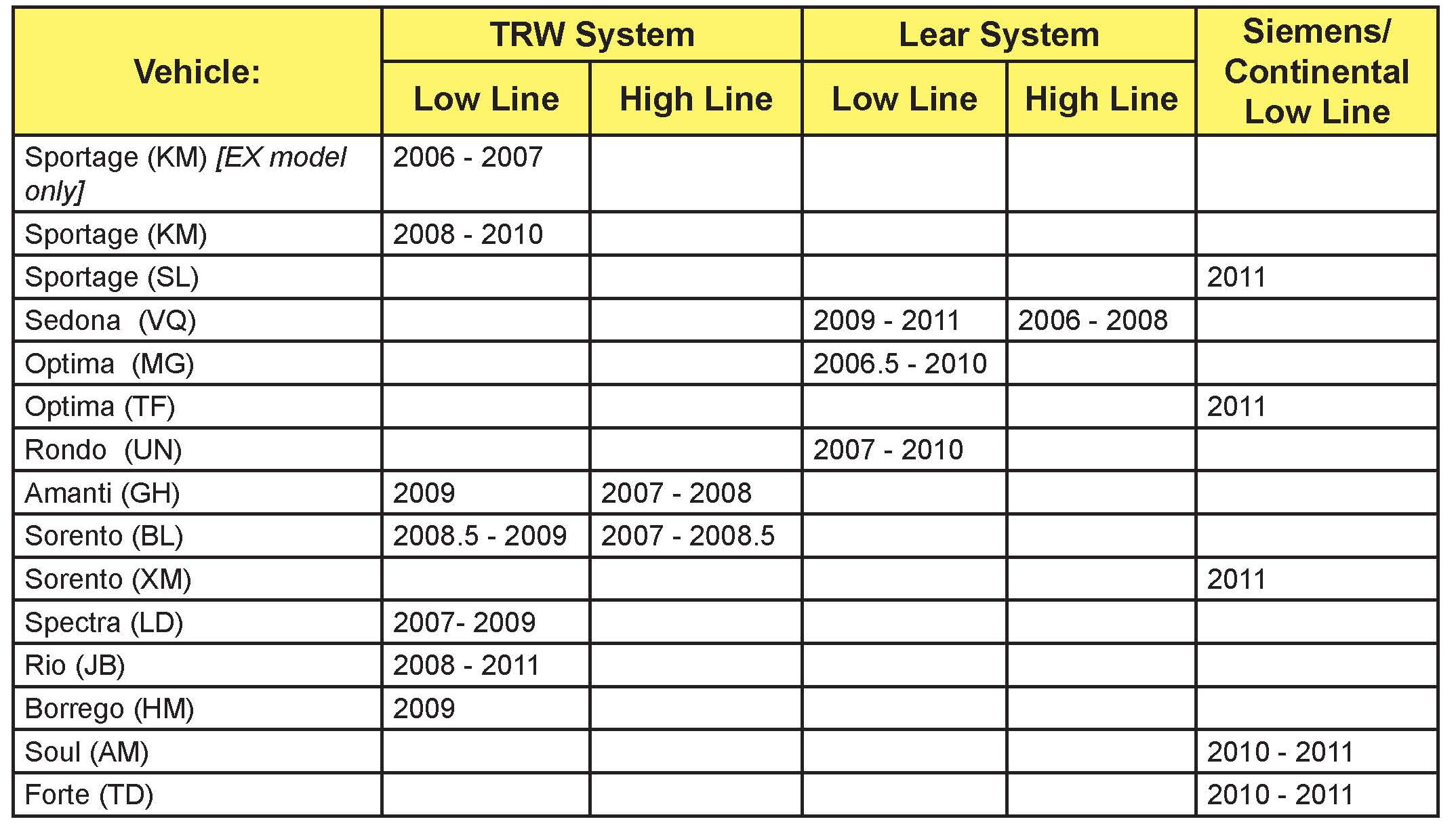In 2008 and 2009 Kia changed from High Line to Low Line systems on Amanti (GH) and Sorento (BL) vehicles. For these vehicles the technician should add a "1" after the "GH" or "BL" for a High Line or a "2" for Low Line.