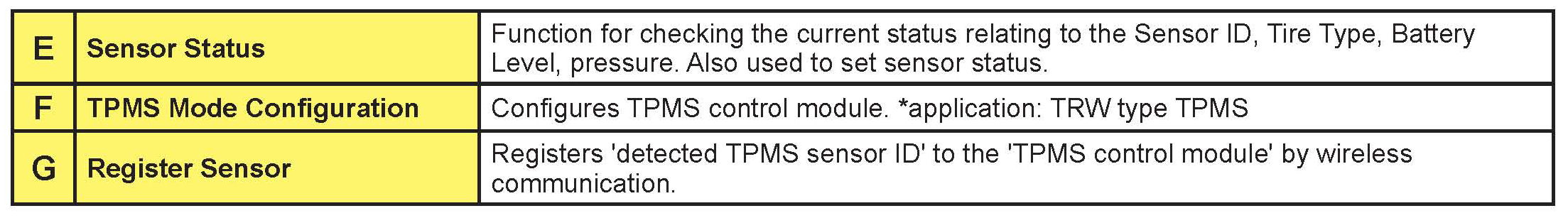 This function is used to manually input the ID of the TPMS sensors to the TPMS control module. The TPMS Sensor ID can be registered automatically by going to "Register Sensor" function.