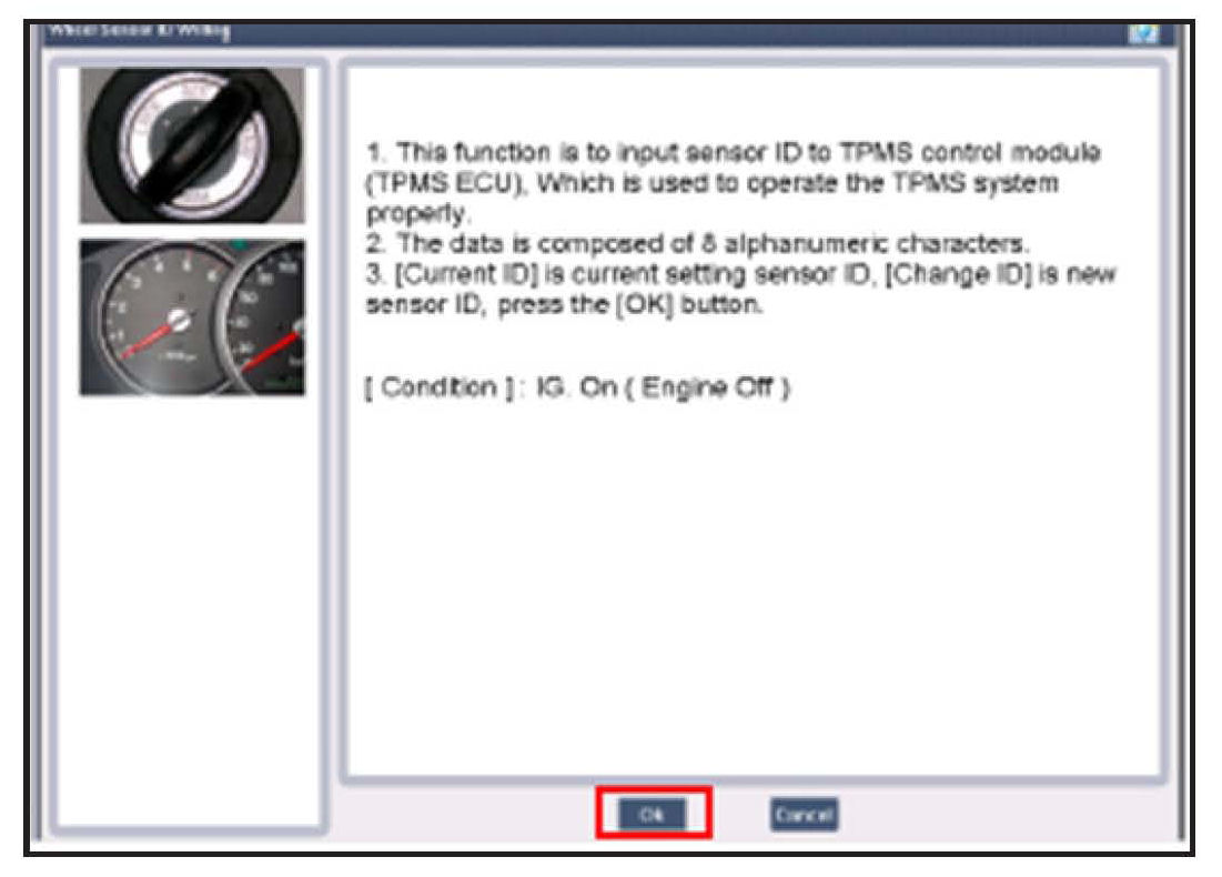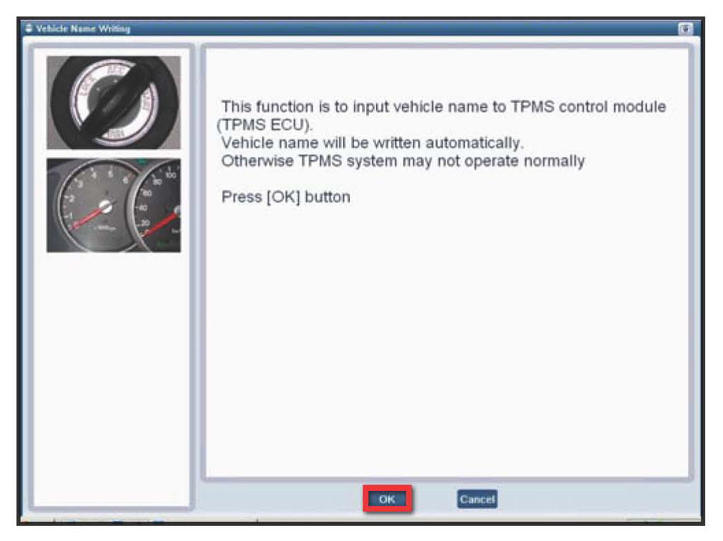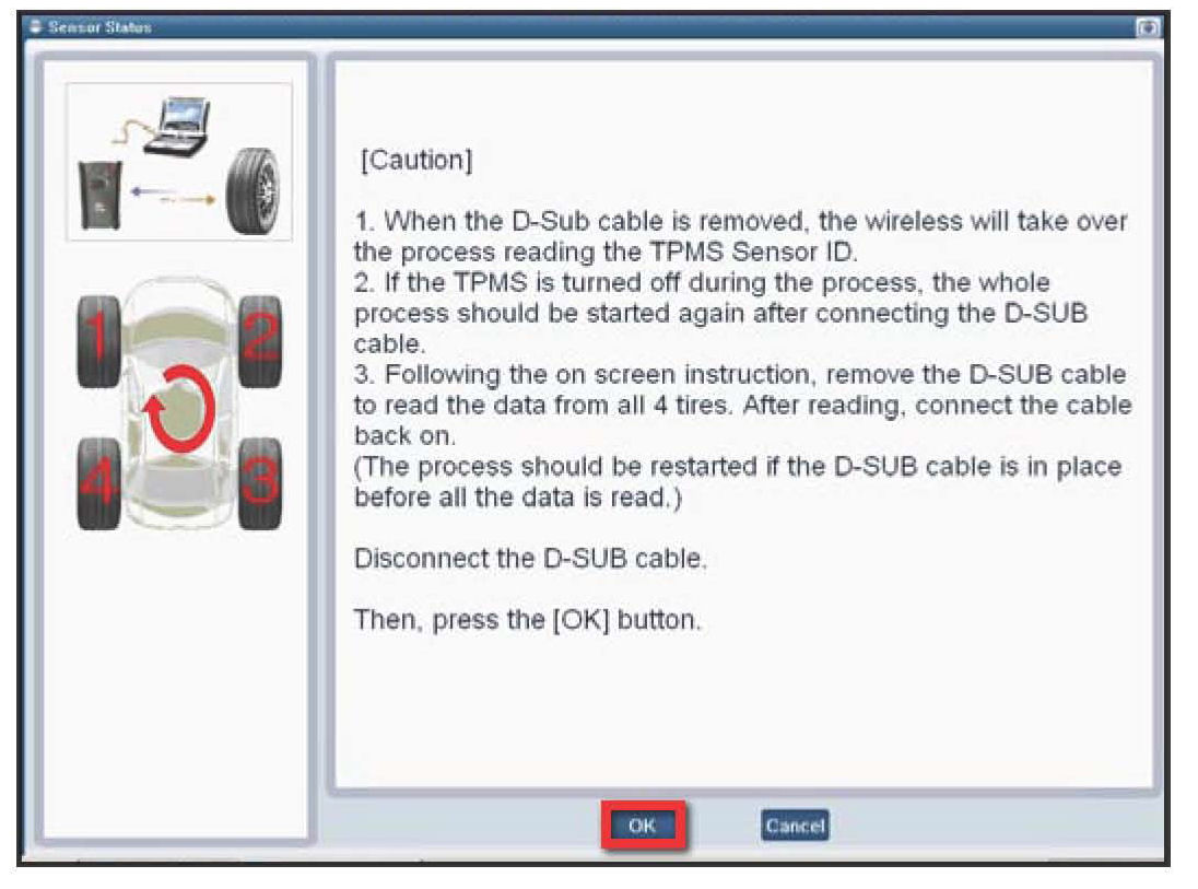 1. After following the procedure displayed on the screen, press the "OK" button. The ODS will communicate wi4h the GDS TPMS Module through the D-Sub Cable P/No: G1PDDGA004