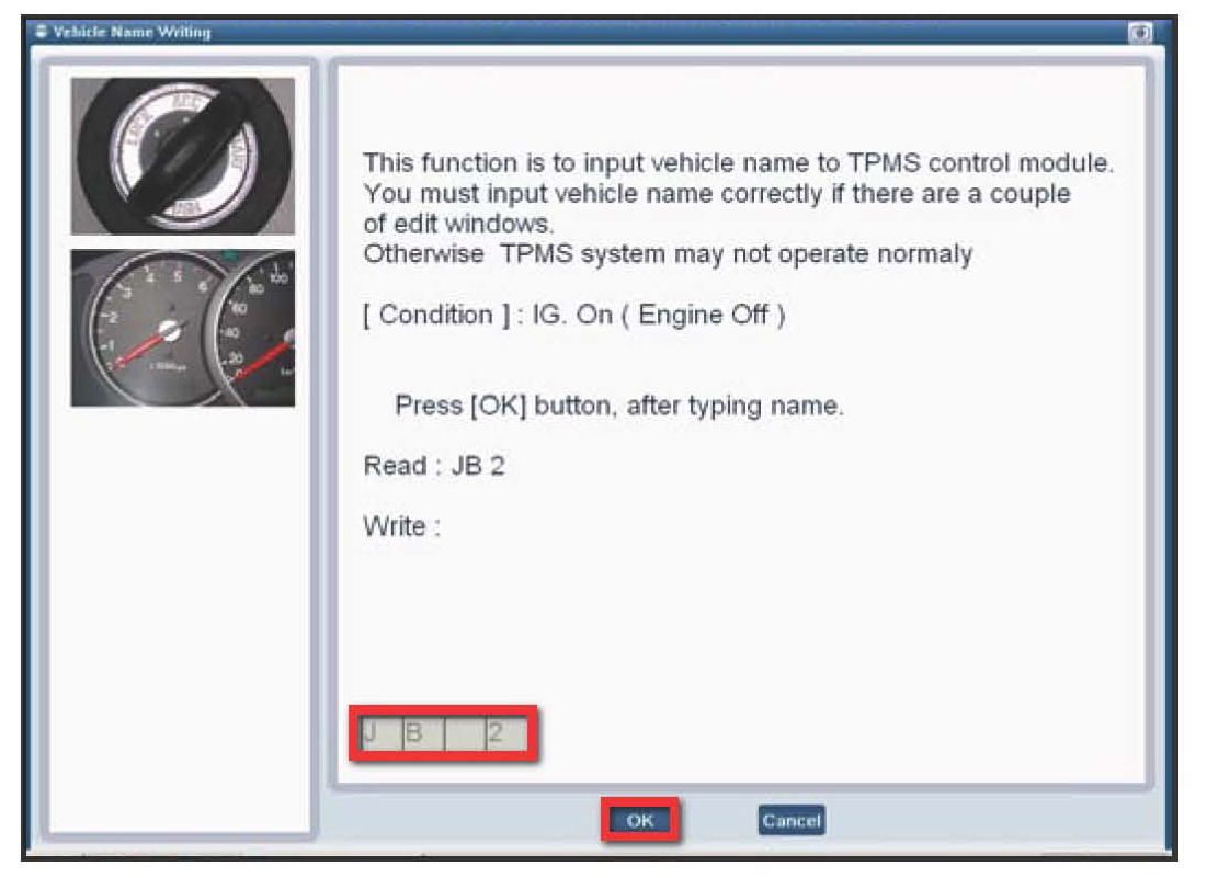 2. The Vehicle Name can be verified on this page The vehicle name next to Read is the name recorded in the TPMS Control Module. The vehicle name listed in the lower left of the text box is the name that should be entered Whether or not the names match press OK. If the Read vehicle name did not already register the correct name it will after pressing OK.