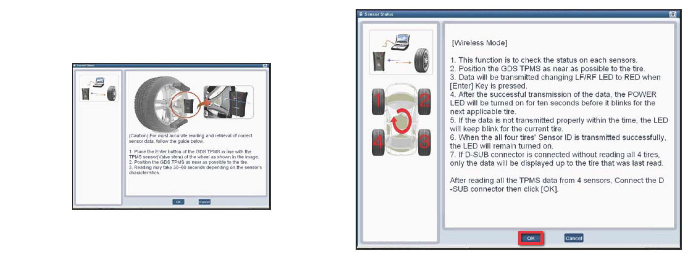 If power to the TPMS module is lost during this operation, reconnect the D-SUB cable and recharge the GDS TPMS module.