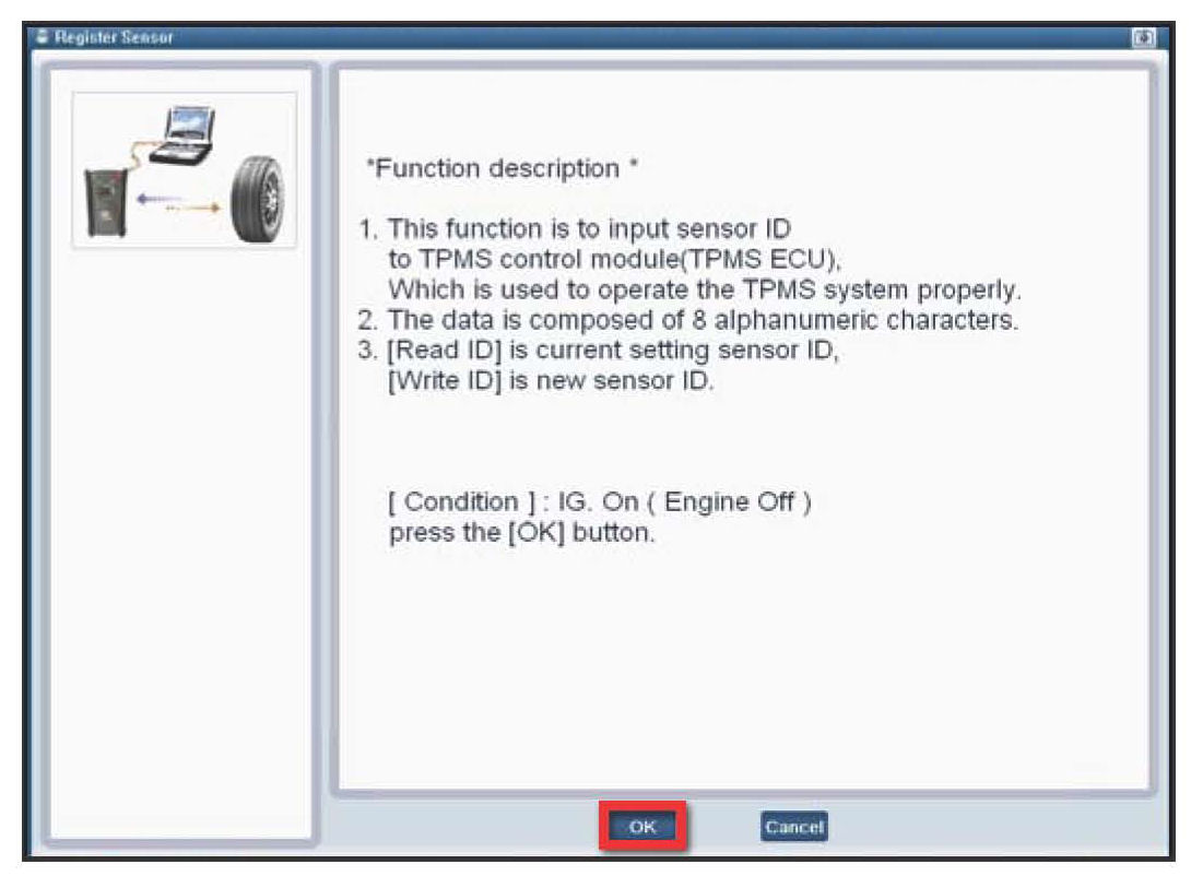 When the TPMS control module or the TPMS sensor is replaced, the TPMS sensor ID could be registered using this function for the TPMS system to operate properly.