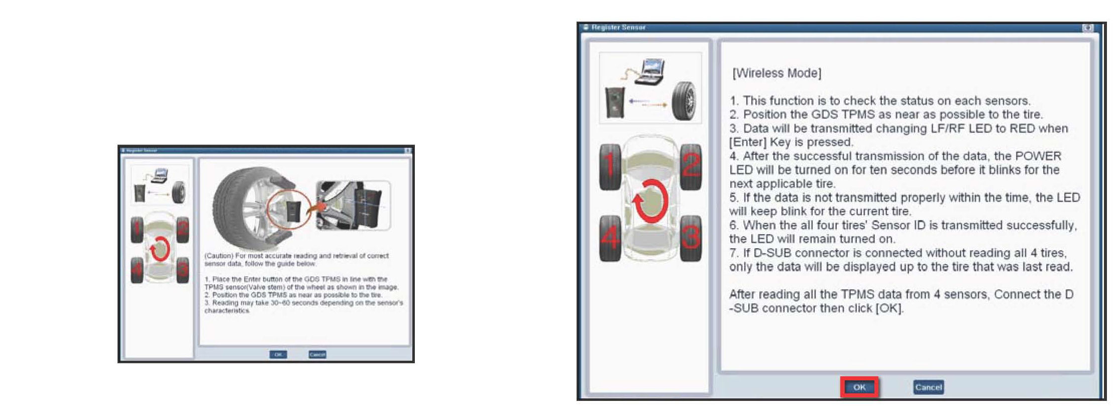 1. Use "Register Sensor" to read the sensor ID numbers and input them into the TPMS control module.