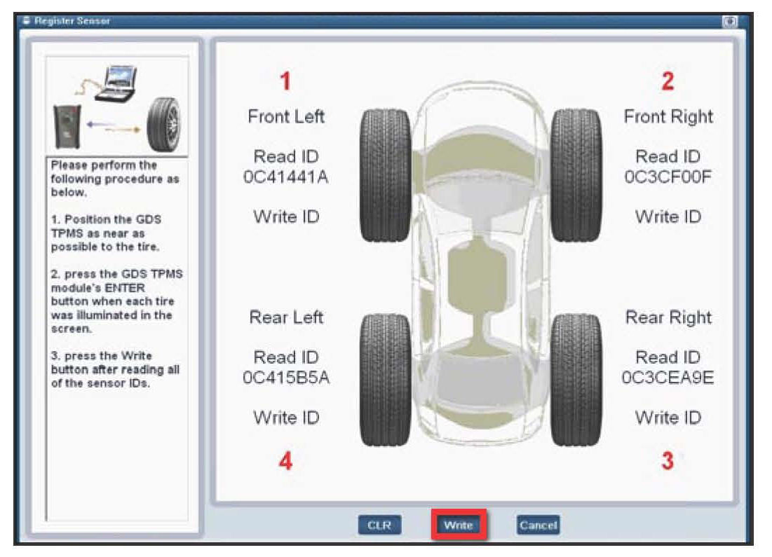 4. After reading the sensor D from each sensor press the Write button to save the Sensor ID to the TPMS contro module.