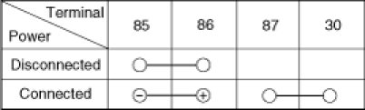 1. There should be continuity between the No.30 and No.87 terminals when power and ground are connected to the No.85 and No.86 terminals.