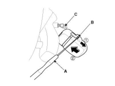 1. Remove the rain sensor cover first. Be careful not to damage the cover latch by applying excessive force. To remove the latch, pull aside the latch using the cover hole (B) with the little (-) screwdriver (A).