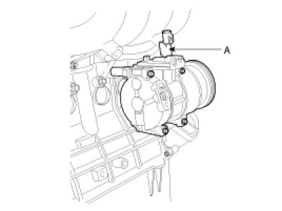 6. Disconnect the compressor clutch connector (A), and then remove 4 mounting bolts and the compressor.
