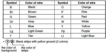 The following abbreviations are used to identify wire colors in the circuit schematics.