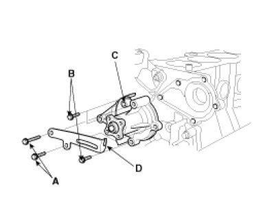 Install the water pump (C) and a new gasket with the 3 bolts (B).