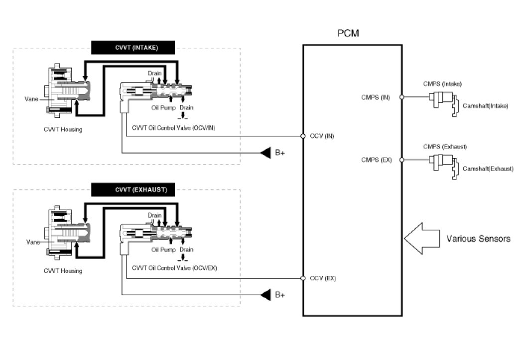 - the CVVT Oil Control Valve (OCV) which supplies the engine oil to the cam phase or runs out the engine oil from the cam phase in accordance with the PCM PWM (Pulse With Modulation) control signal,