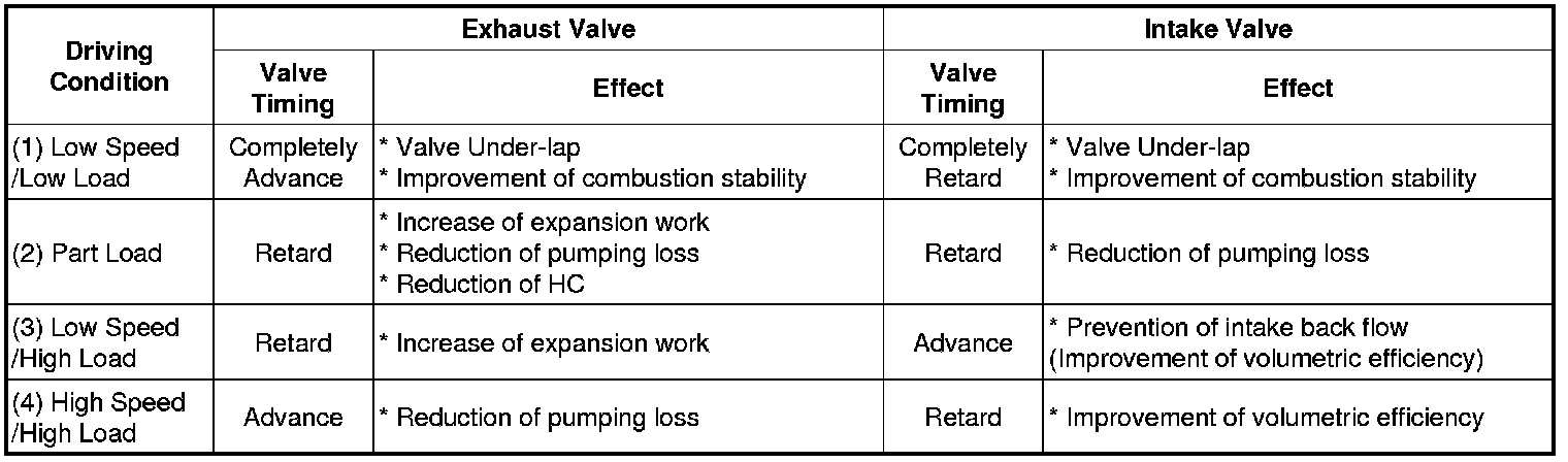 Continuous Variable Valve Timing (CVVT) system advances or retards the valve timing of the intake and exhaust valve in accordance with the PCM control signal which is calculated by the engine speed and load.