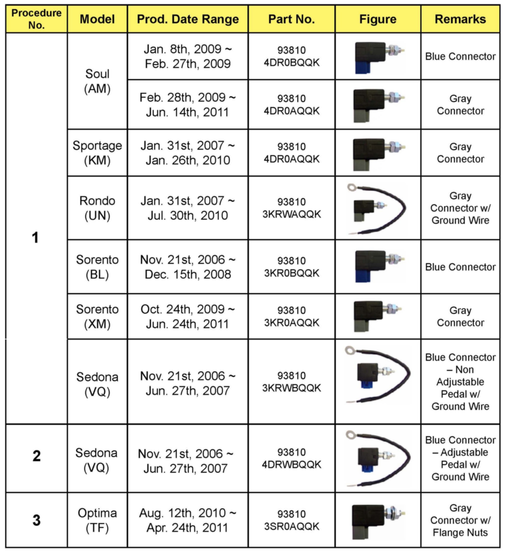 This bulletin provides information relating to the replacement of the stop lamp switch on some 2007-2010MY Sportage (KM), 2007-2010MY Rondo (UN), 2007MY Sedona (VQ), 2010-2011MY Soul (AM), 2007-2011MY Sorento (BL/XM), and 2011MY Optima (TF) vehicles within the production date ranges shown in the table below. Carbonization of the point of contact for the stop lamp switch can intermittently interfere with electric current through the switch circuit. As a result, one of the switch functions can affect the vehicles brake lights and they may not come on when the brake pedal is depressed or may remain illuminated when the pedal is released.