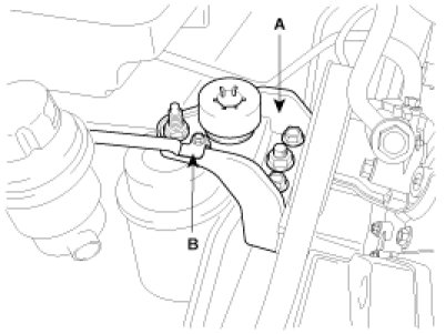 11. Install the engine mounting bracket(A) and the ground cable(B).