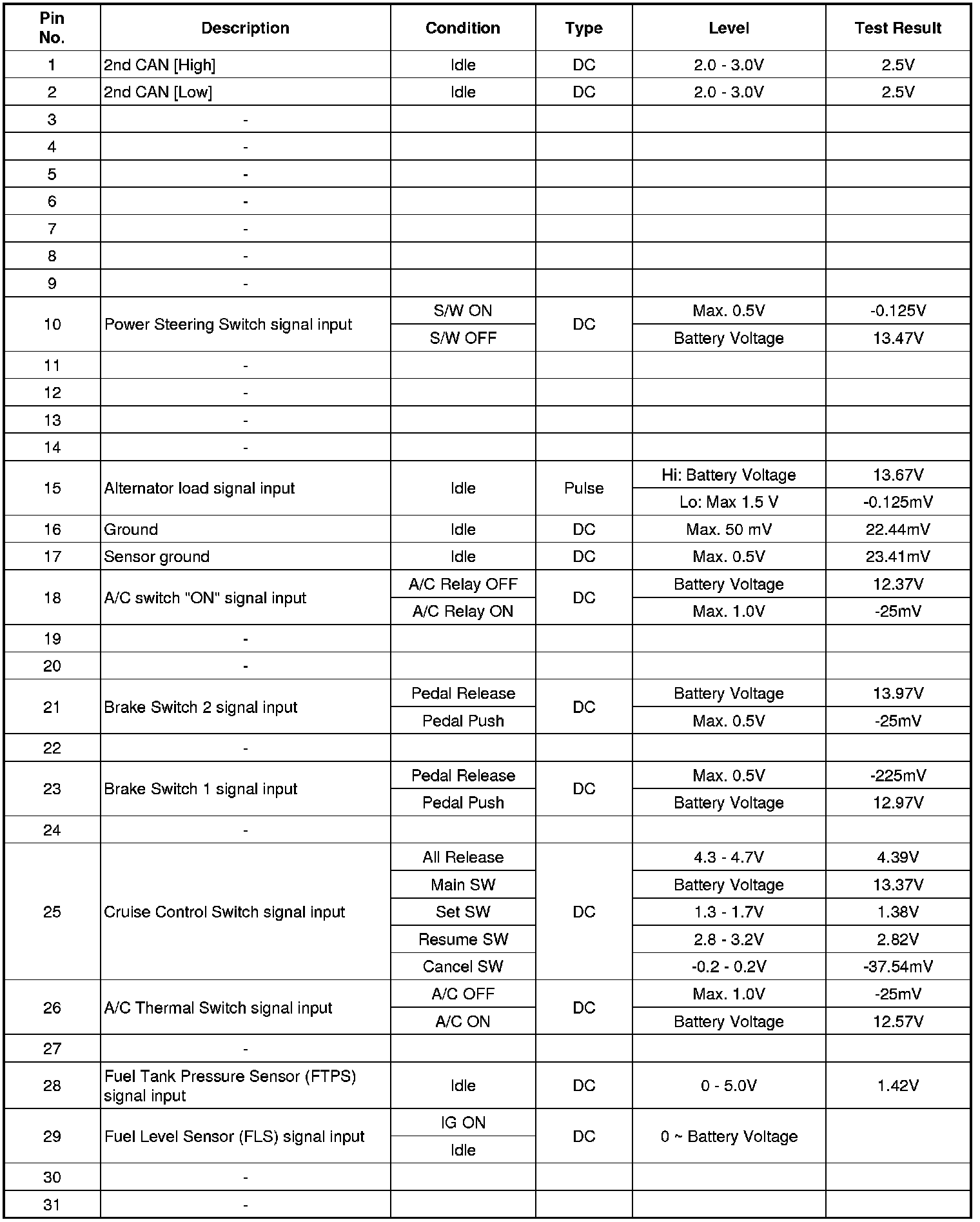 Pinout Values and Diagnostic Parameters