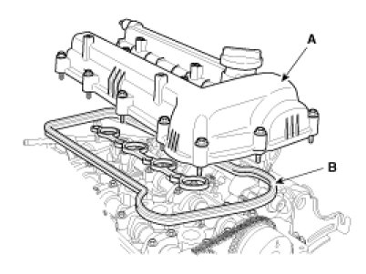 15. Remove the cylinder head cover(A) with its gasket(B).