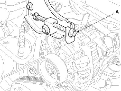 24. Adjust tension by tightening the alternator tension adjust bolt(A).