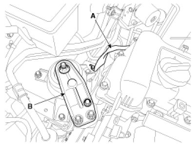 3. Install the hydraulic tensioner(A) and remove the pin(B).